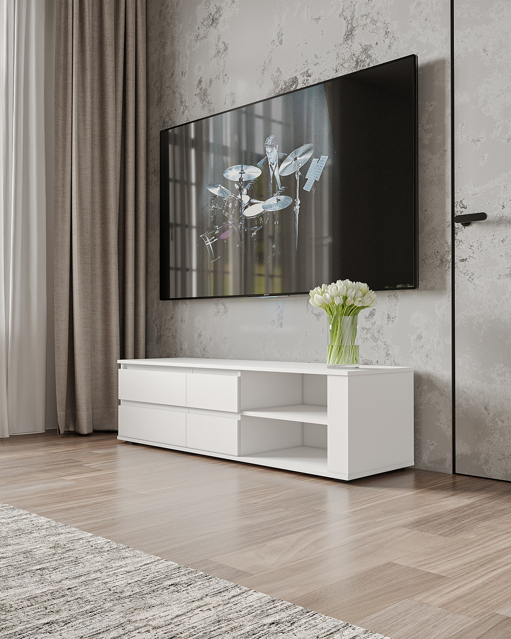 Тумба під ТВ має 2 дверцят та 2 відкриті полички на яких можна зберігати пульт від телевізора, журнали, приставку, книги.