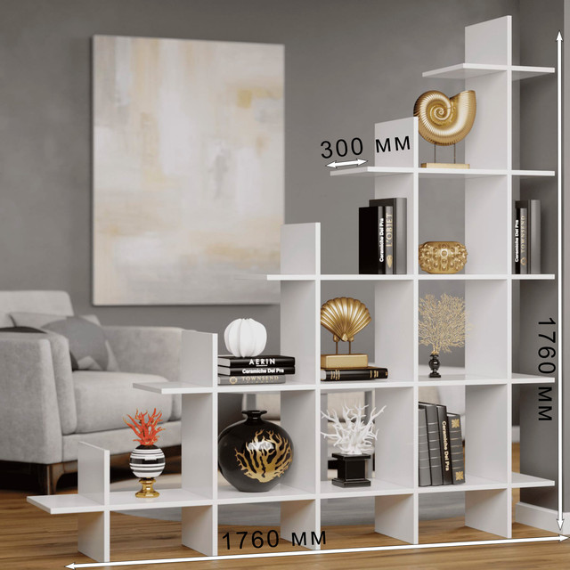 Виготовлений із міцного ламінованого ДСП, стелаж вирізняється стійкістю до механічних пошкоджень і вологи. Габарити: ширина 1760 мм, висота 1760 мм, глибина 300 мм - забезпечують місткість без перевантаженості простору. Доступні кольори легко впишуться в сучасний або класичний інтер'єр.