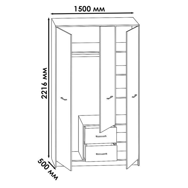 Розмір: Ширина 1500 мм / Висота 2216 мм / Глибина 500 мм