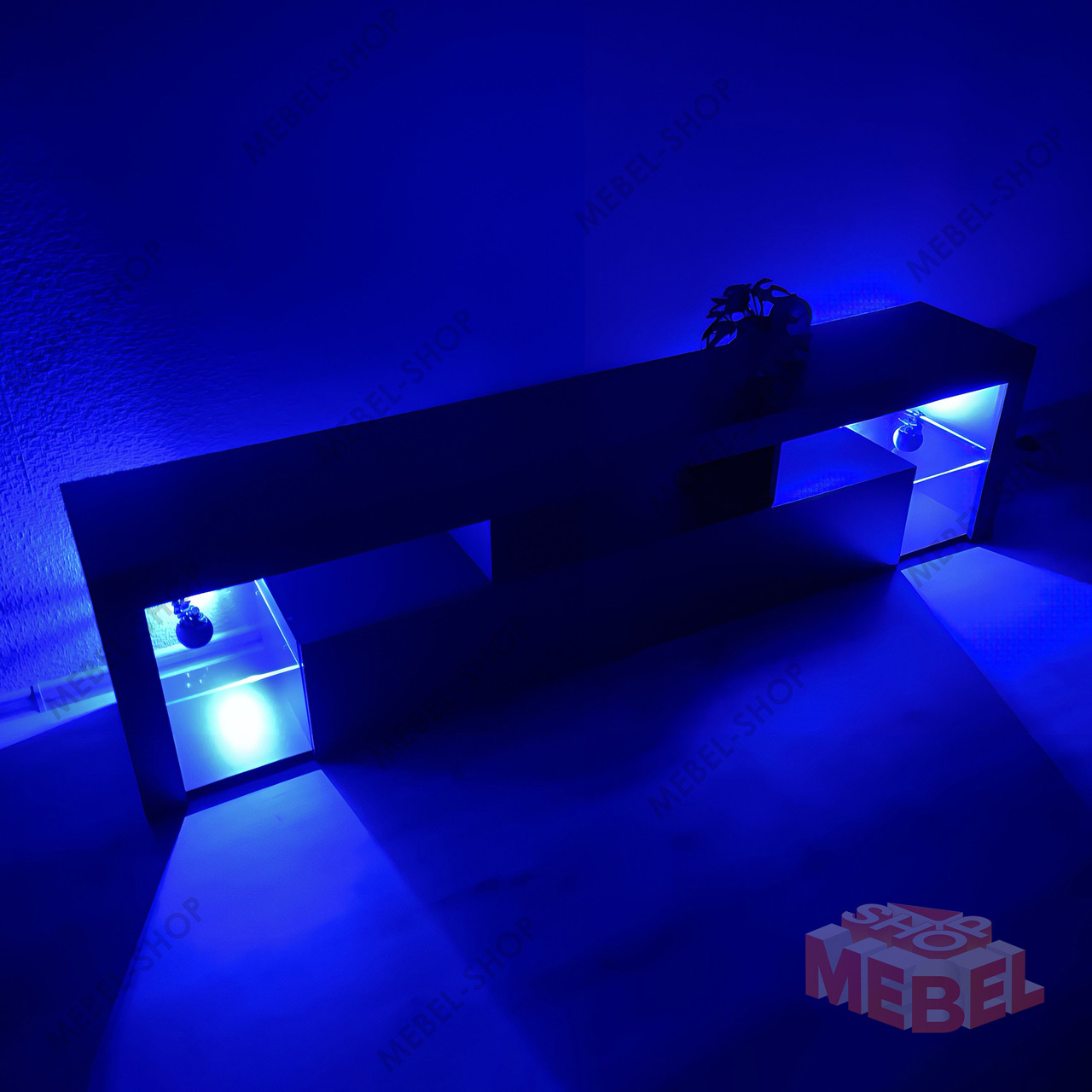 Тумба під телевізор з підсвічуванням ТБ тумба 2 м завширшки з 5 відкритими та 2 закритими полицями з ламінованого ДСП